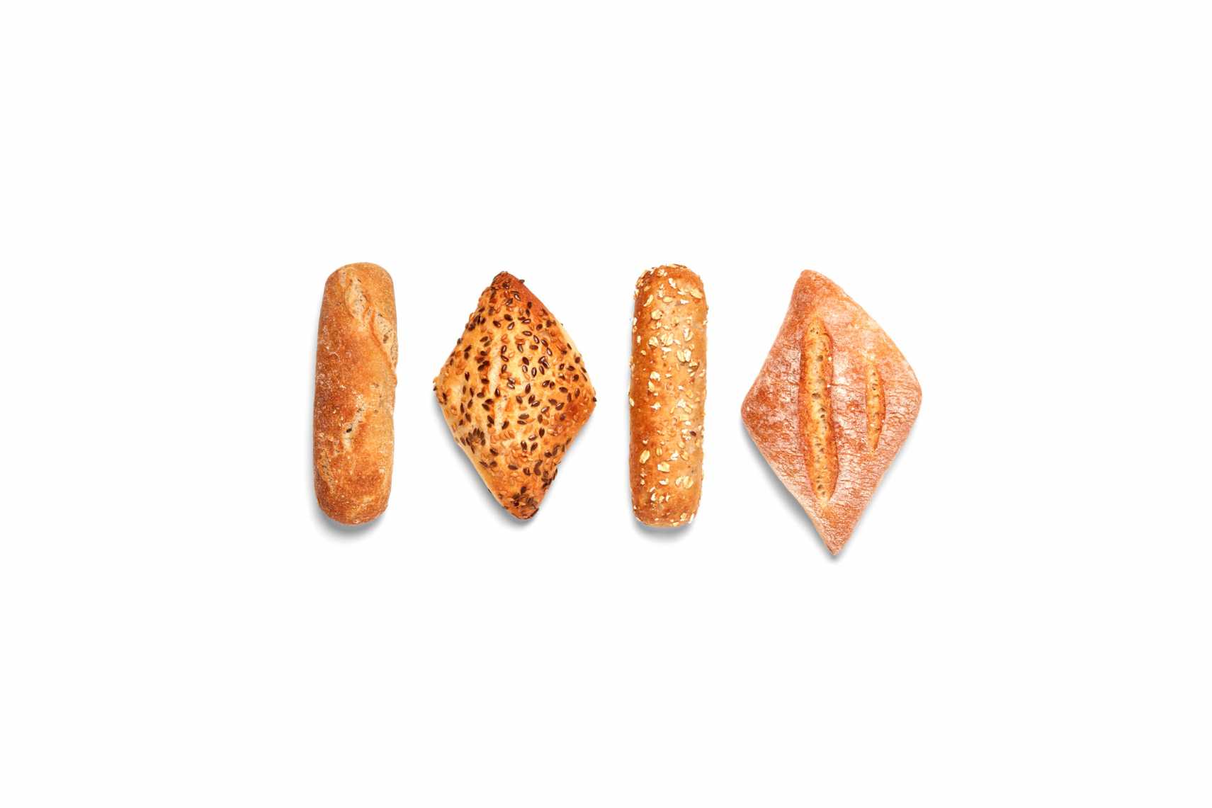 Enthält 25 Stück von jedem der folgenden Gourmet-Brötchen: Mini Provenzal Flute, Mini Getreide Flute, Mini Nuss- & Leinsaat Diamond und Diamond Brot.