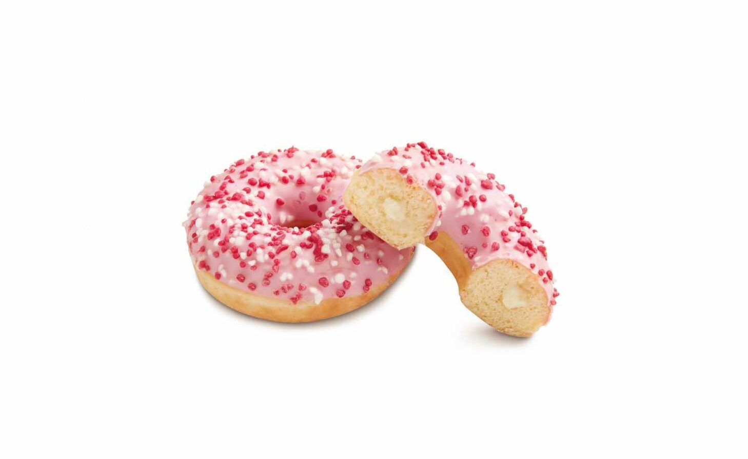 À moitié recouvert d'un glaçage rose, surmonté de boules de sucre aromatisées à la fraise et à la crème et fourré d'une délicieuse crème au chocolat blanc.