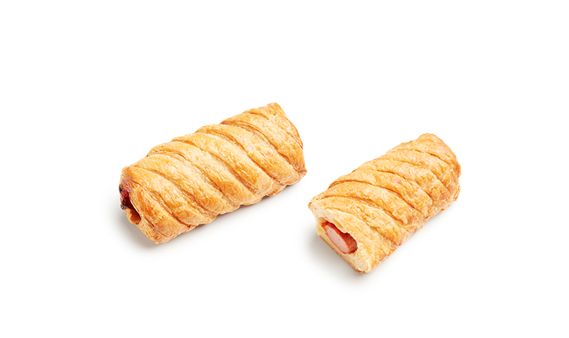 Roulé de pâte feuilletée, légèrement marqué, fourré d'une saucisse fumée assaisonnée de ketchup.